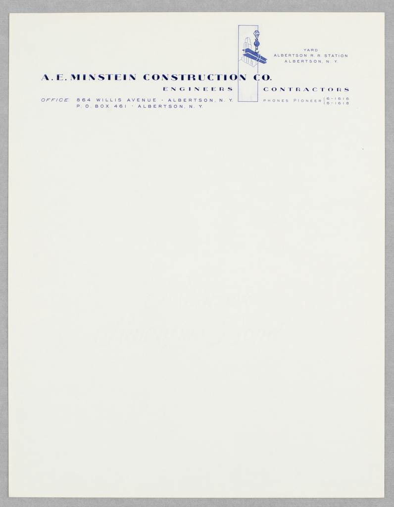 Letterhead, A. E. Minstein Construction Co. / Engineers Contractors, Albertson, New York