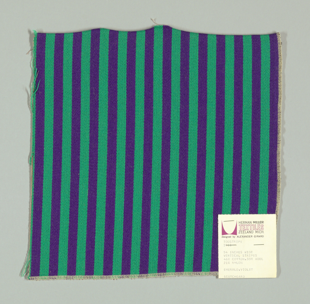 This is a Sample. It was designed by Alexander Hayden Girard and produced by Herman Miller Furniture Company. It is dated 1965 and we acquired it in 1969. Its medium is cotton (46%), wool (33%), and nylon (21%) and its technique is warp-faced twill. It is a part of the Textiles department.