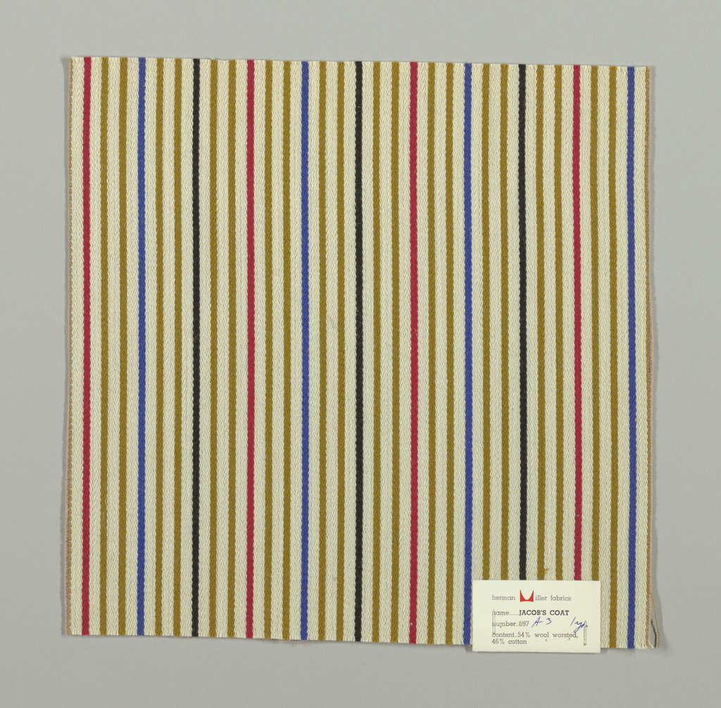 This is a Sample. It was designed by Alexander Hayden Girard and produced by Herman Miller Furniture Company. It is dated 1955 and we acquired it in 1969. Its medium is wool (54%) and cotton (46%) and its technique is warp-faced twill. It is a part of the Textiles department.