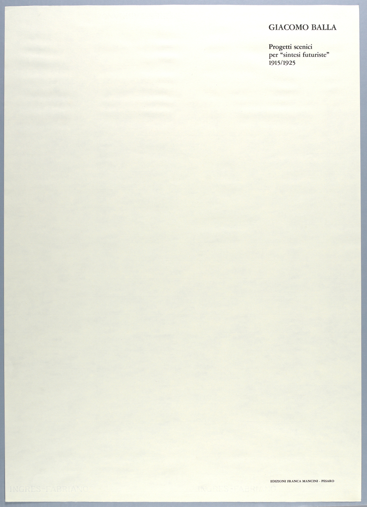 Print, Title Page, "Progetti Scenici per 'Sintesi Futuriste'" from "Progetti Scenici Per 'Sintesi Futuriste'" Portfolio, "Set Designs for 'Futurist Syntheses'"; Designed by Giacomo Balla (Italian, 1871–1958); Published by Edizioni Franca Mancini (Italy); letterpress in black ink on cream laid paper; H x W: 69.9 × 50.6 cm (27 1/2 × 19 15/16 in.); Gift of Tamar Cohen; 1999-6-5-2