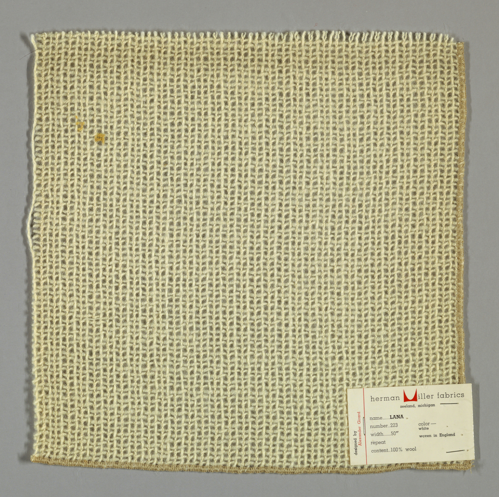 This is a Sample. It was designed by Alexander Hayden Girard and produced by Herman Miller Furniture Company. It is dated 1959 and we acquired it in 1969. Its medium is wool and its technique is plain and gauze weave. It is a part of the Textiles department.