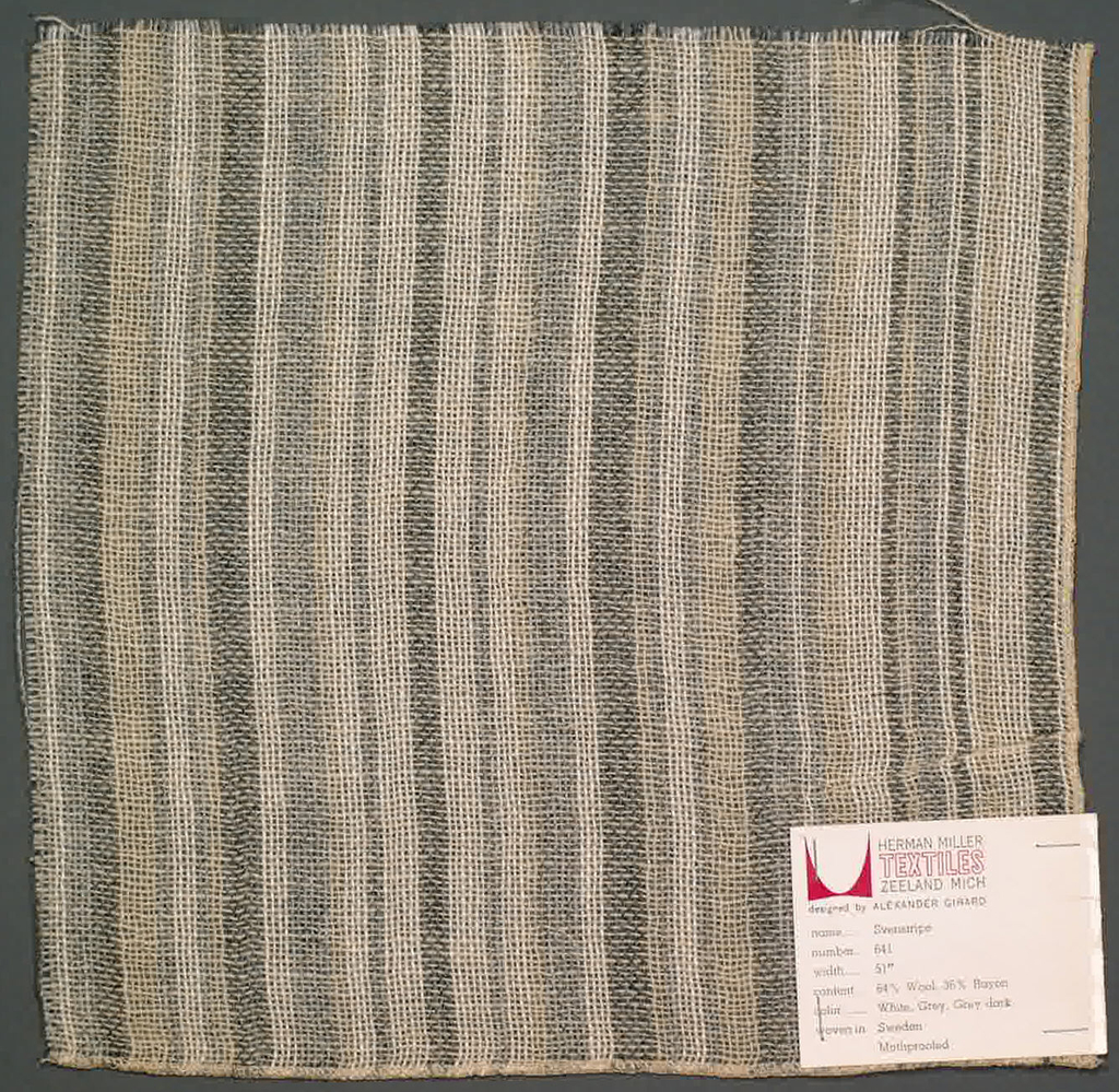 This is a Sample. It was designed by Alexander Hayden Girard and produced by Herman Miller Furniture Company. It is dated 1961 and we acquired it in 1969. Its medium is wool (64%) and rayon (36%) and its technique is plain weave. It is a part of the Textiles department.