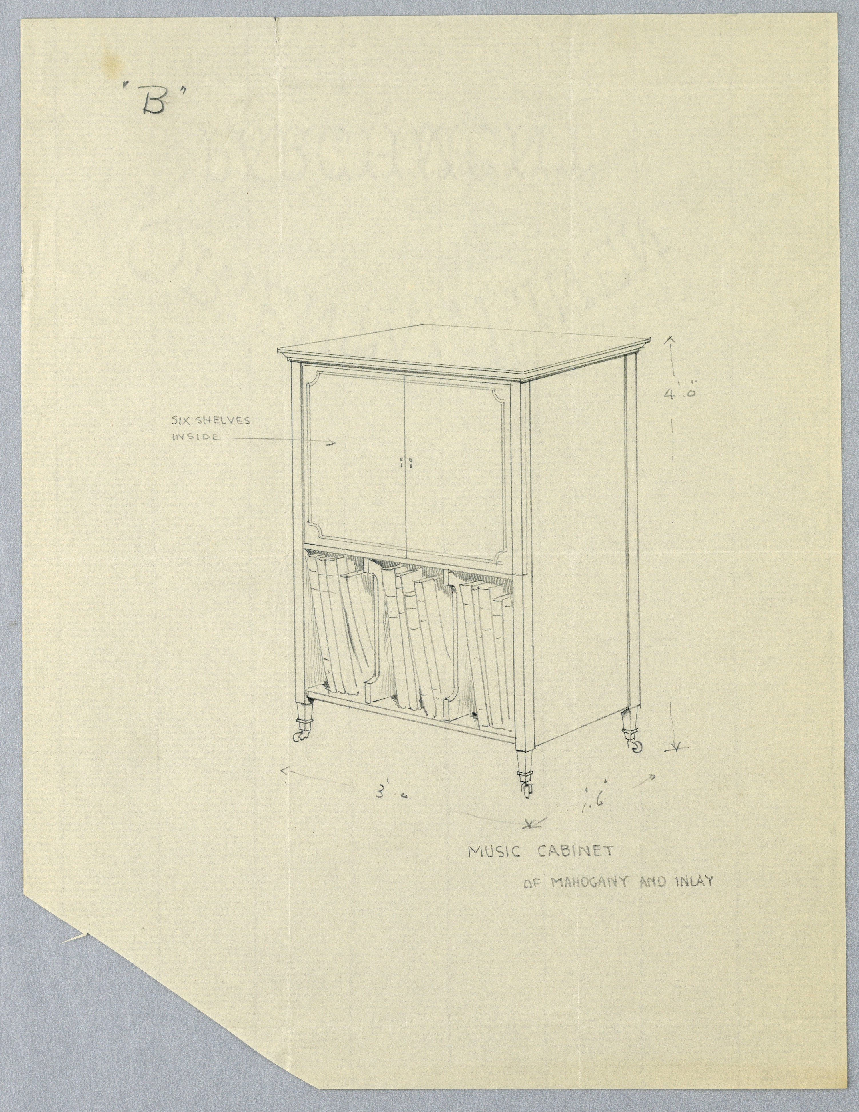Inscribed in graphite, upper left corner of sheet: "B"; at upper left of design with arrow pointing to left door panel: SIX SHELVES INSIDE; at upper right, lower center, and lower left, numerical notations indicating dimensions; below image, right: MUSIC CABINET / OF MAHOGANY AND INLAY