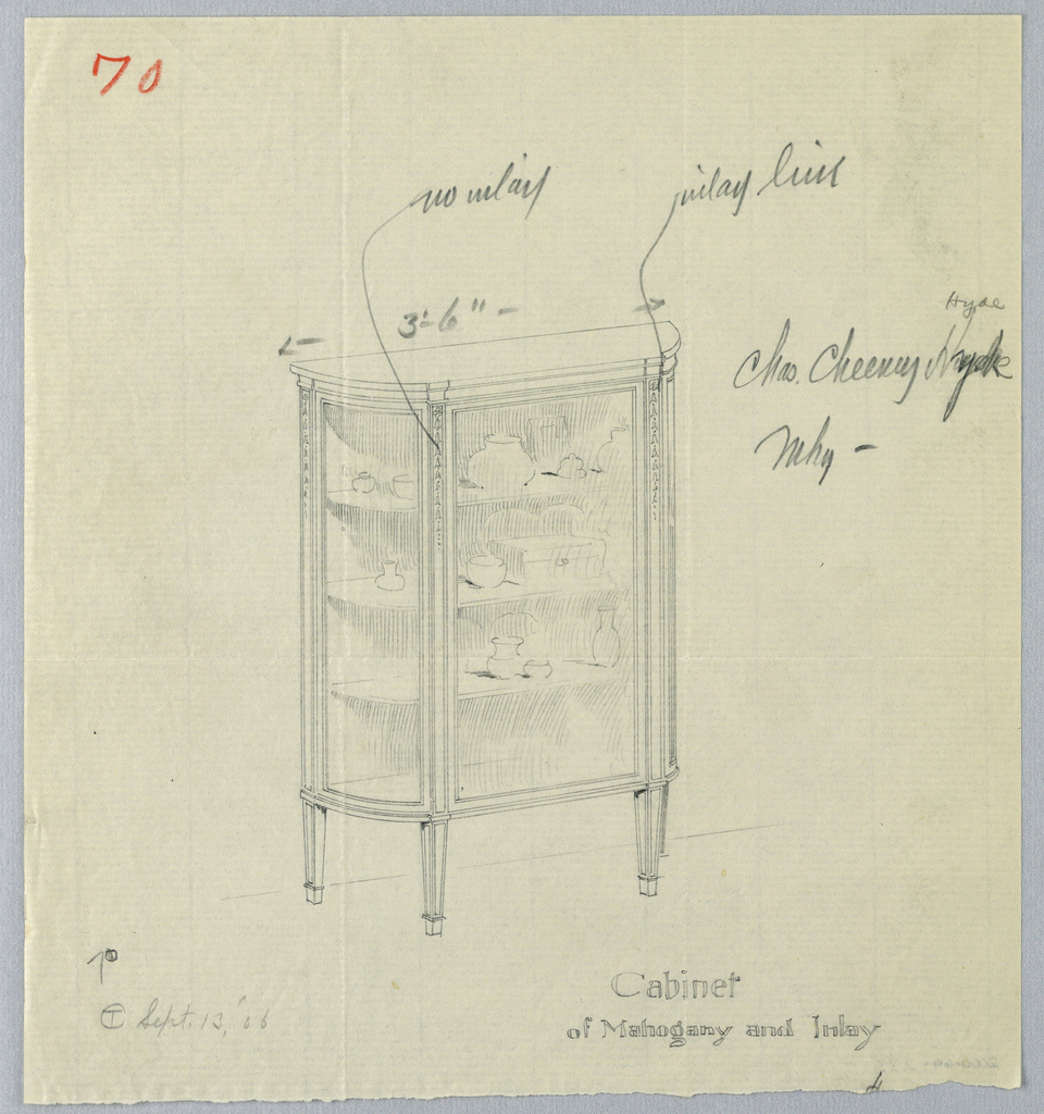 Inscribed in red color pencil, upper left corner of sheet: 70; in graphite, lower left corner of sheet: 1° / T[in circle] Sept. 13, '06; lower right corner: Cabinet / of Mahogany and Inlay; at upper left and right of design: no inlay / inlay [illeg.]; at upper right of sheet: Chas. Cheekey[?] Hyde / Hyde / Mhg-; upper center of design, numerical notations indicating dimensions