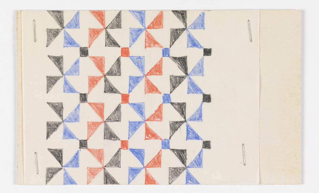 Drawing, Textile Design: Inventory Card; Designed by Alexander Hayden Girard (American, 1907–1993); Office of Herman Miller Furniture Company (United States); USA; black, blue, and red color pencil on white tracing paper fastened to white cardboard with four staples; 10.2 x 13.7 cm (4 x 5 3/8 in.); Gift of Alexander H. Girard; 1969-165-420