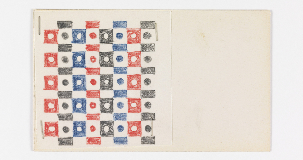 Drawing, Textile Design: Inventory Card; Designed by Alexander Hayden Girard (American, 1907–1993); Office of Herman Miller Furniture Company (United States); USA; red, black, and blue color pencil on white wove paper fastened to white cardboard with four staples; 9.3 x 9.3 cm (3 11/16 x 3 11/16 in.) Mount: 9.8 x 16.4 cm (3 7/8 x 6 7/16 in.); Gift of Alexander H. Girard; 1969-165-422