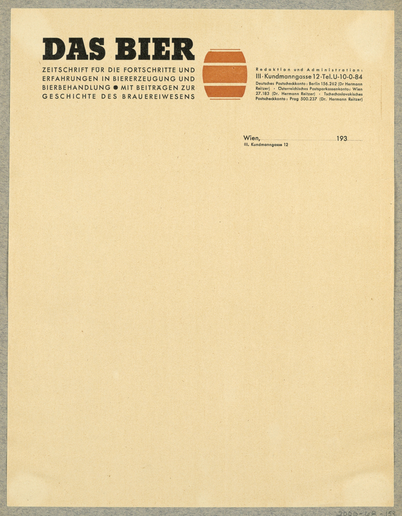 Letterhead, Das Bier, Wien; Published by Jahoda & Siegel (Austria); letterpress on cream wove paper; Gift of James Howard Fraser; 2000-68-153