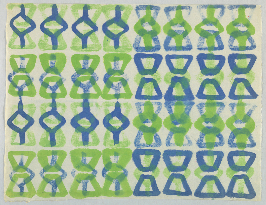 This is a Sidewall. It was designed by Barbara White. It is dated 1958 and we acquired it in 2000. Its medium is hand-folded and dyed japanese paper. It is a part of the Wallcoverings department.