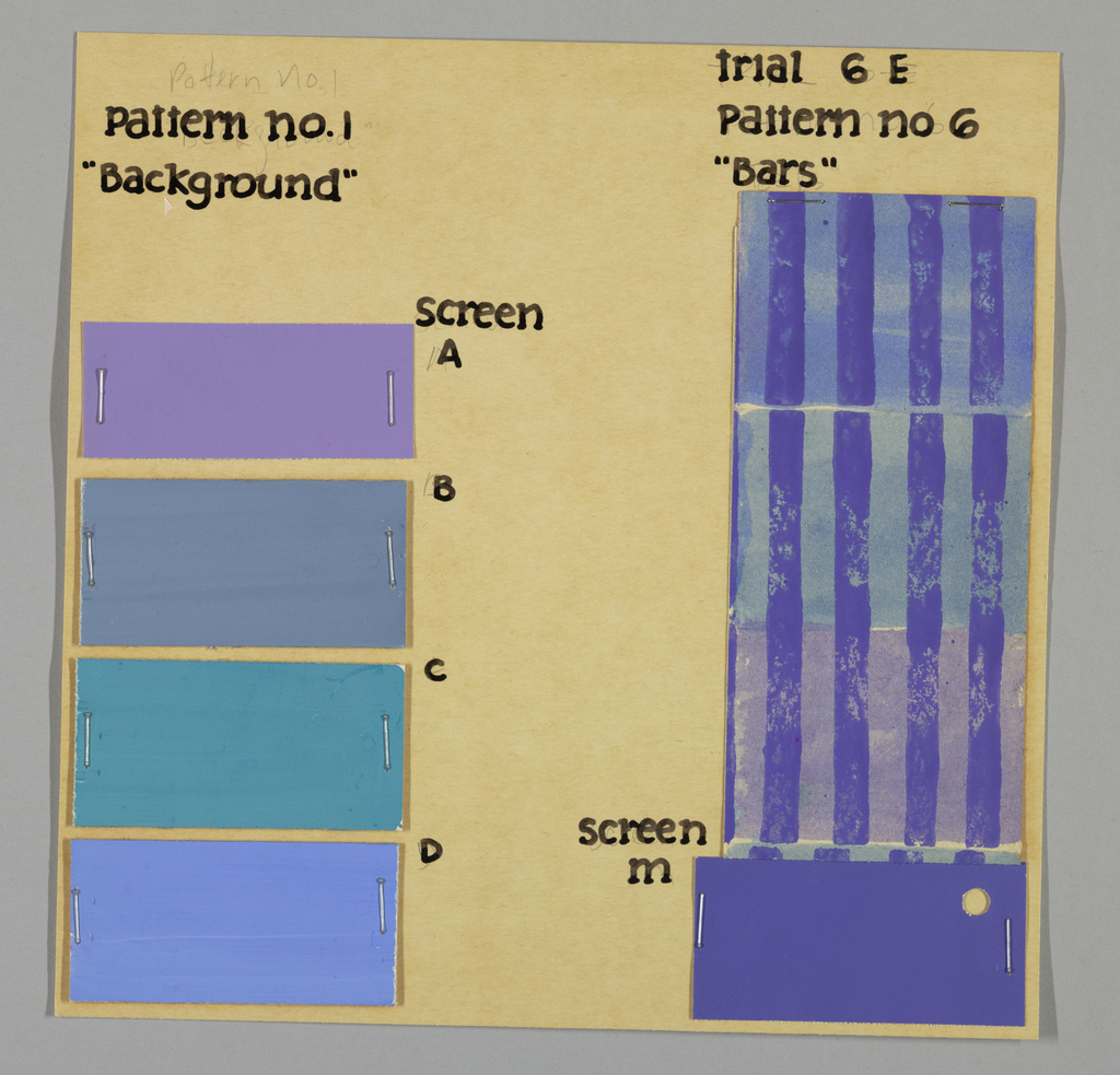 Design For Textile, Bars; Designed by Alexander Hayden Girard (American, 1907–1993); watercolor on paper, stapled to card and hand-lettered; H x W: 22.9 × 22.9 cm (9 × 9 in.); Gift of Alexander H. Girard; 1969-165-1268