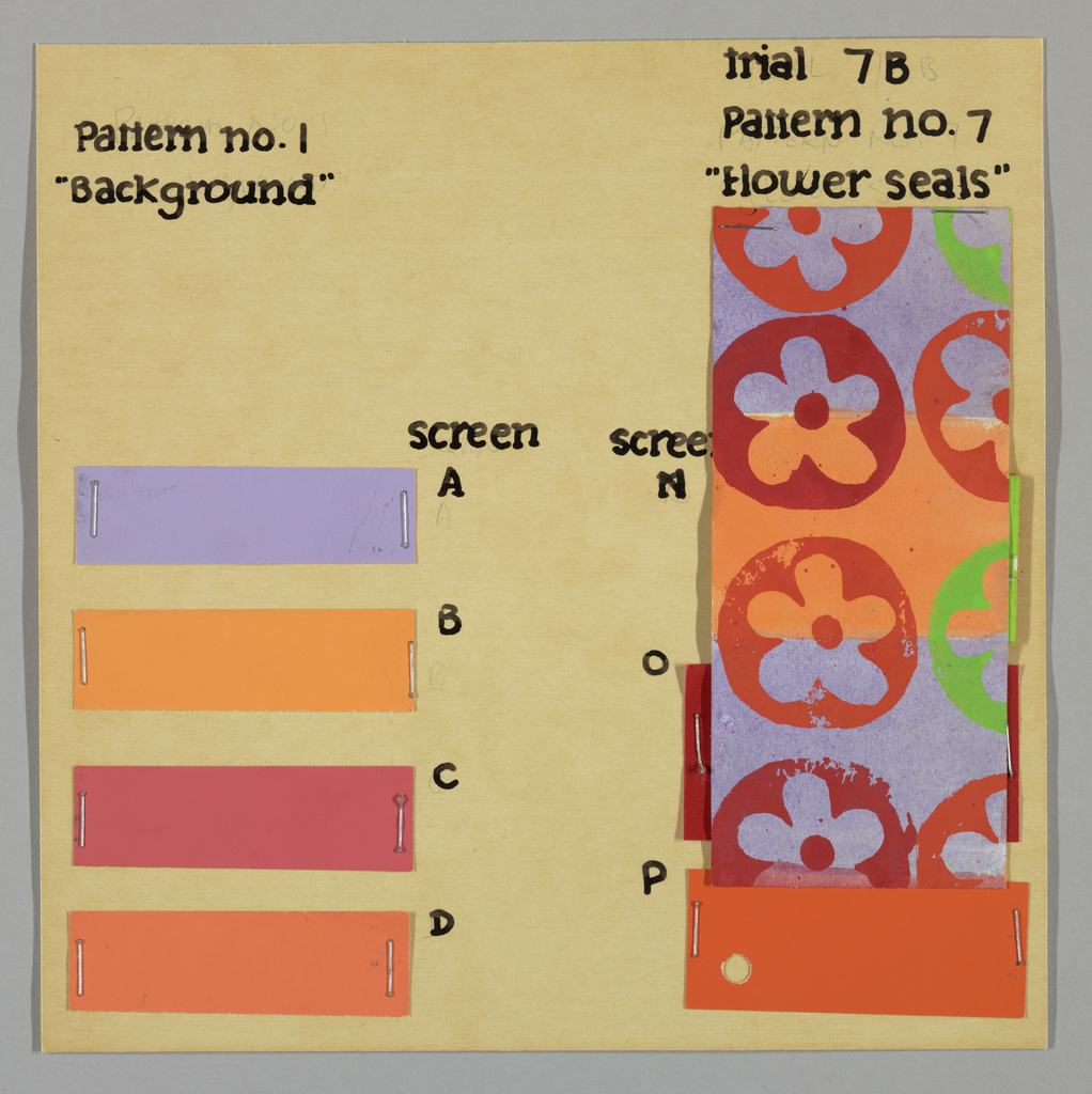 This is a design for textile. It was designed by Alexander Hayden Girard. It is dated ca. 1958 and we acquired it in 1969. Its medium is watercolor on paper, stapled to card and hand-lettered. It is a part of the Textiles department.