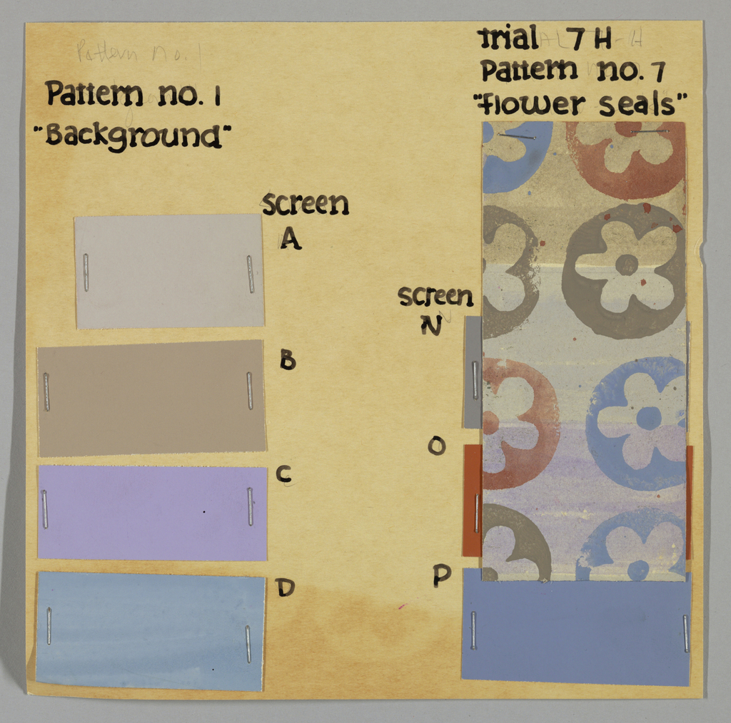 This is a design for textile. It was designed by Alexander Hayden Girard. It is dated ca. 1958 and we acquired it in 1969. Its medium is watercolor on paper, stapled to card and hand-lettered. It is a part of the Textiles department.