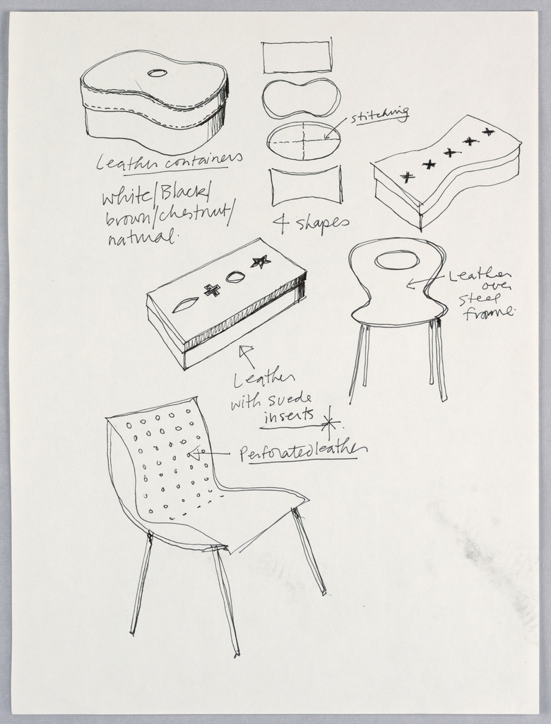 Inscribed with rollerball pen in black ink, upper left: leather containers [underlined]/white/Black/brown/chestnut/natural; upper center: [arrow pointing down to right] stitching [underlined]/ 4 shapes; center right: Leather over steel frame; center: [arrow pointing up to right] Leather with suede inserts ["inserts" underlined]/ [arrow pointing right] Perforated leather [underlined]