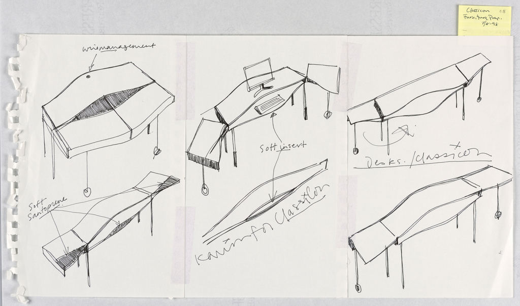 Inscribed in rollerball pen in black ink, left sheet, upper half: [arrow pointing down to left] wire management ["man" underlined]; lower half: [three arrows to right pointing up to right and down] soft santoplene ["santoplene" underlined]; center sheet: [two arrows pointing up and down] soft insert ["in" underlined]/for Classicon ["Classicon" underlined]; right sheet, center: desks./Classicon [underlined]; upper half: *