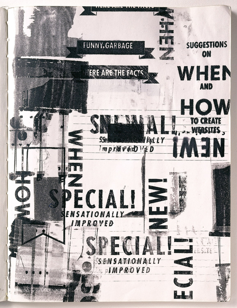 A crucial starting point for Girardi’s and Capuozzo’s Funny Garbage designs is their personal sketchbooks, which number in the hundreds of volumes. Each designer actively compiles and refers to their joint repository of sketches, scribbles, letter form compositions and experiments, textural rubbings and scuff marks, collection of assorted fragments, scraps and cast-offs from popular culture (comics, candy wrappers, bar codes, standardized forms, ticket stubs, parts of packaging, children’s comics stickers, parts of credit cards, pay stubs, etc.). To Girardi and Capuozzo, these images, gestures, and textures are a treasure trove of ideas for recreating images for screen environments that reconnect the viewer to the physical world. While their designs appear accidental, they are, in fact, governed by strict rules of graffiti art and design. Thus, both this sketchbook and the sketchbook by Capuozzo are invaluable resource books of concepts that are catalysts to designs later realized on the web or in other media.