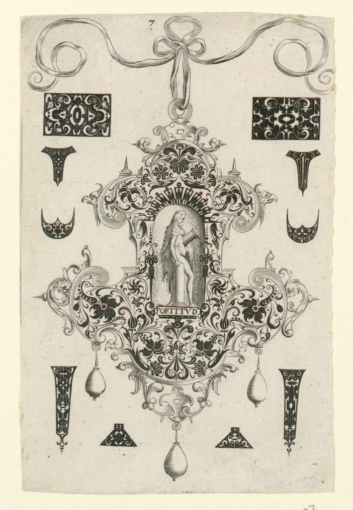 What is exceptional about this series of prints is that it is engraved in two techniques, linework and blackwork, to suggest to the artisan two modes of decoration. The blackwork ornamentation shows ideas for enameled jewelry, notably rings, and the linework presents ideas for sculptural, jewel-encrusted pendants with elegant pear-shaped pearls. Mignot excelled in creating jewelry designs that incorporated figures and iconography in the Renaissance tradition, but he combined this with what was then a new taste for a rich display of gems. On each copper printing plate, the surface was maximized to show off as many jewelry design ideas as possible. Surrounding each central pendant are unrelated ideas for enameled rings, presented in blackwork.
