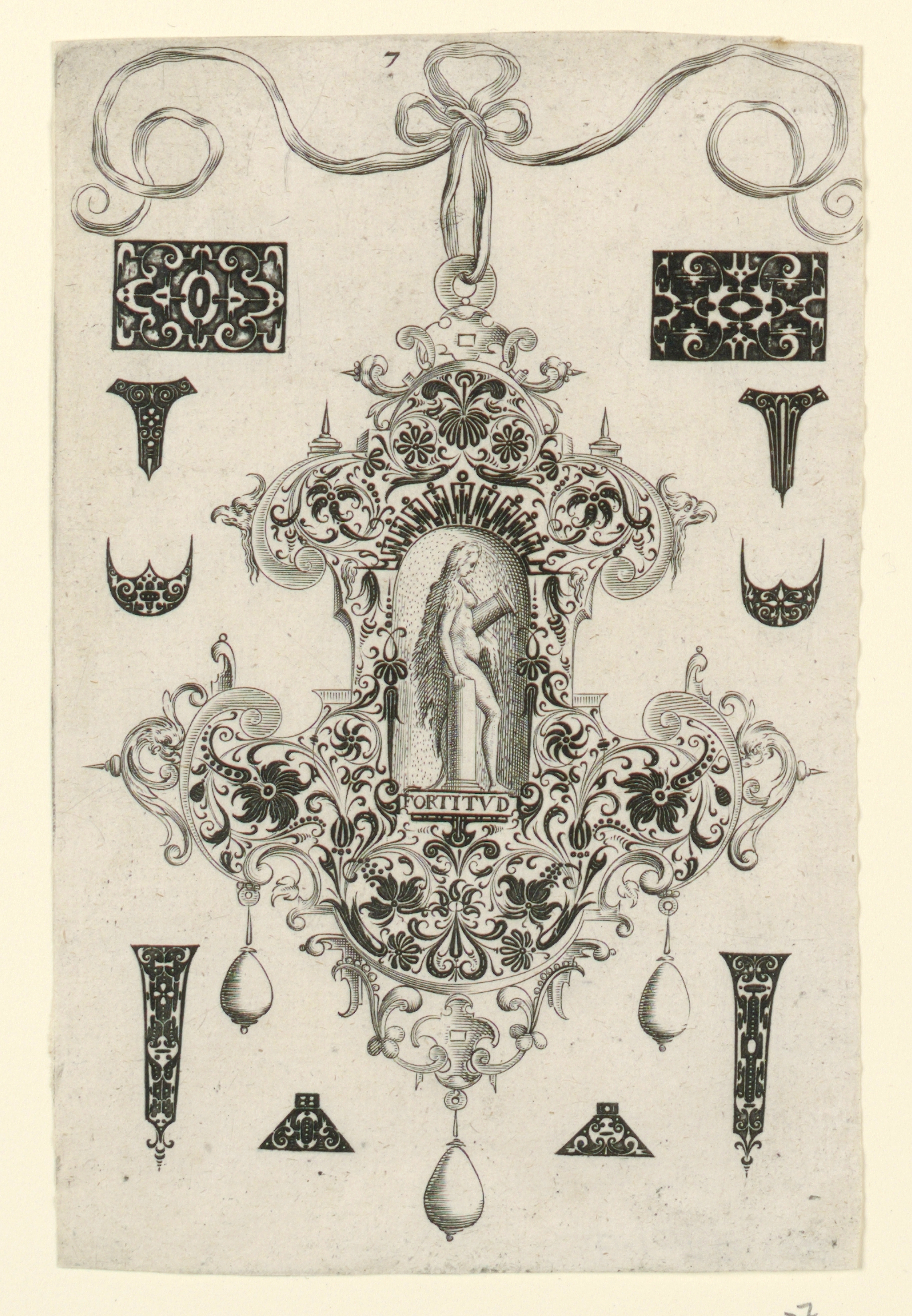 Print, Plate 7, from a series of eight pendant designs with the cardinal virtues; Johann Theodor de Bry (German, 1561 - 1623); engraving on paper; H x W: 15.2 × 10 cm (6 in. × 3 15/16 in.); Museum purchase from Drawings and Prints Council Fund; 2001-22-1-7