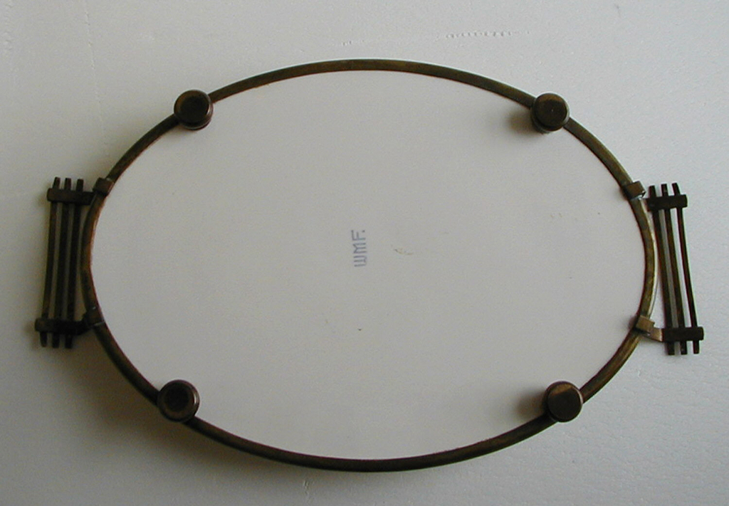 This is a tray. It was manufactured by WMF Aktiengesellschaft. It is dated ca. 1930 and we acquired it in 2000. Its medium is glazed earthenware, brass. It is a part of the Product Design and Decorative Arts department.