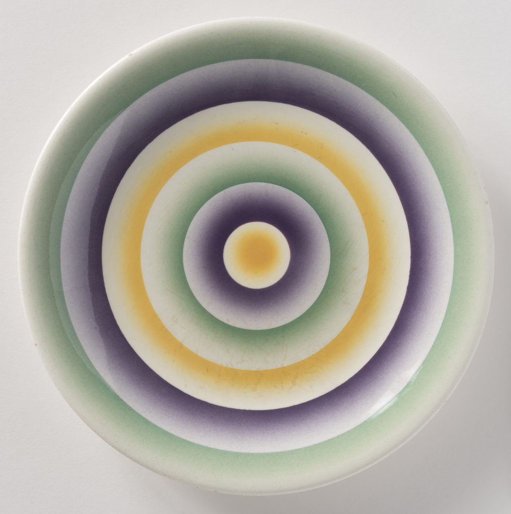 This is a plate. It was manufactured by Wachtersbach. It is dated ca. 1930 and we acquired it in 2000. Its medium is glazed earthenware. It is a part of the Product Design and Decorative Arts department.