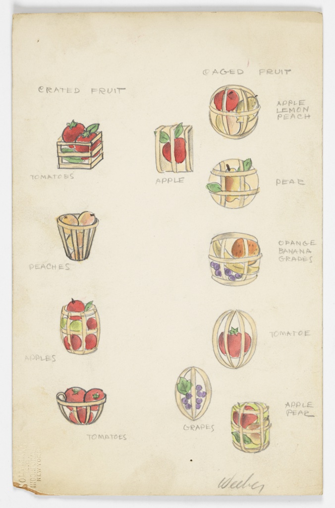 Drawing, Button Design: Crated Fruits and Caged Fruits; brush and watercolor, graphite on illustration board; 24 × 15.4 cm (9 7/16 × 6 1/16 in.); Bequest of Marion Weeber Welsh; 2006-2-121