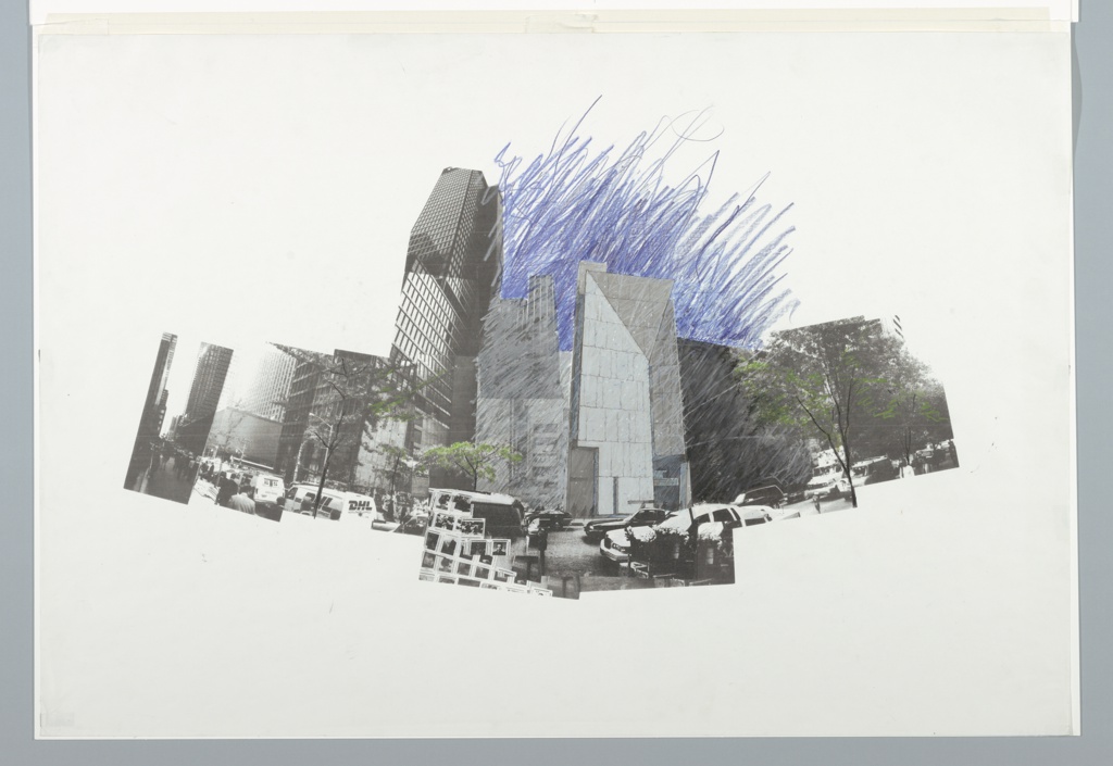Drawing, Collage Perspective, Museum of American Folk Art, New York City; Billie Tsien (b. 1949); Architect: Tod Williams Billie Tsien and Associates; USA; photo-offset and photo-collage, white and blue crayon on white paper; 64.8 x 94.6 cm (25 9/16 x 37 5/16 in.); Gift of Tod Williams Billie Tsien; 2001-18-5