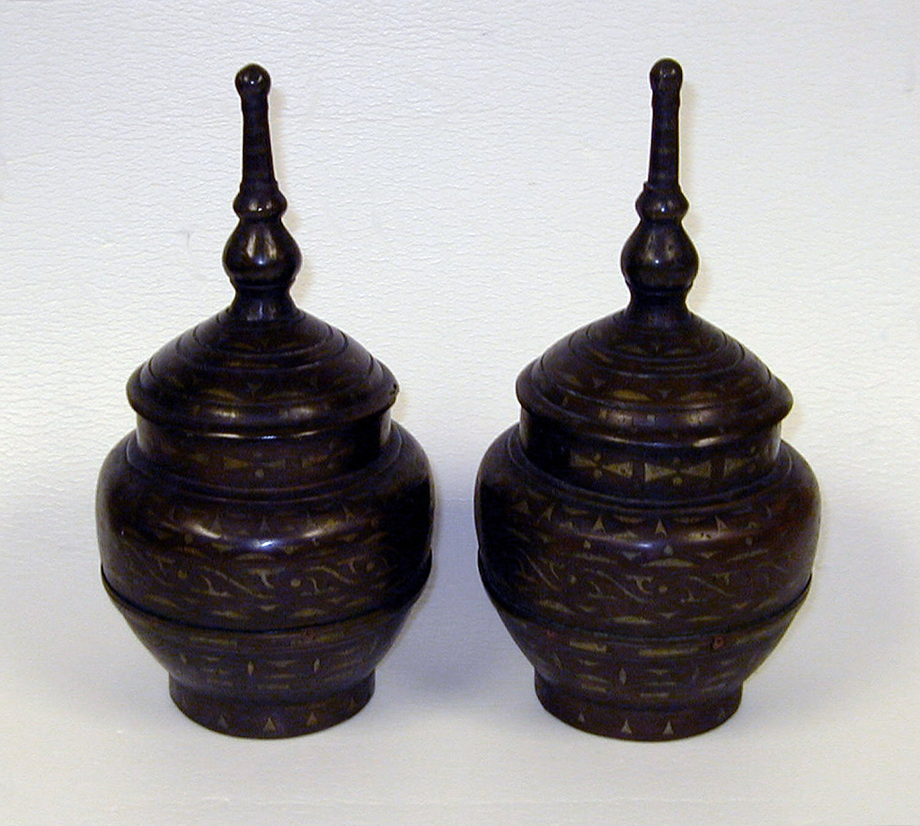 This is a Jar and cover. It is dated possibly 19th century and we acquired it in 1969. Its medium is bronze, inlaid metal. It is a part of the Product Design and Decorative Arts department.