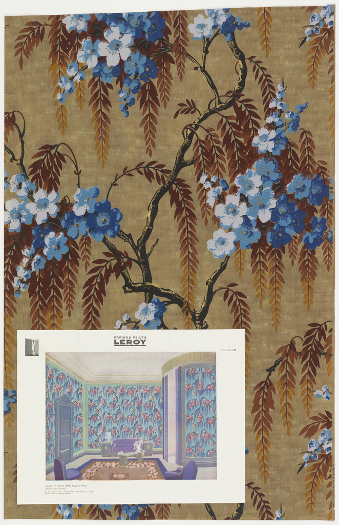 This is one of 60 machine-printed samples proposed for acquisition. These papers were at one time part of a larger sample booked issued by the Isidore Leroy Company in Paris and date to approximately 1930. Leroy was one of the first French wallpaper companies to turn to machine printing. In 1858, they patented a process to improve the transfer of color on surface prints. Throughout the 19th century, the firm’s reputation was equal to that of the Zuber et Cie. During the 1920s, the firm continued to produce high quality wallpapers with designs by René Crevel, Robert Duflos, Emile-Alain Séguy, and Henri Stephany. One of Séguy’s designs is included in this collection. His use of bold color and naturally-inspired forms is evident in his design of a kingfisher seated on a branch.