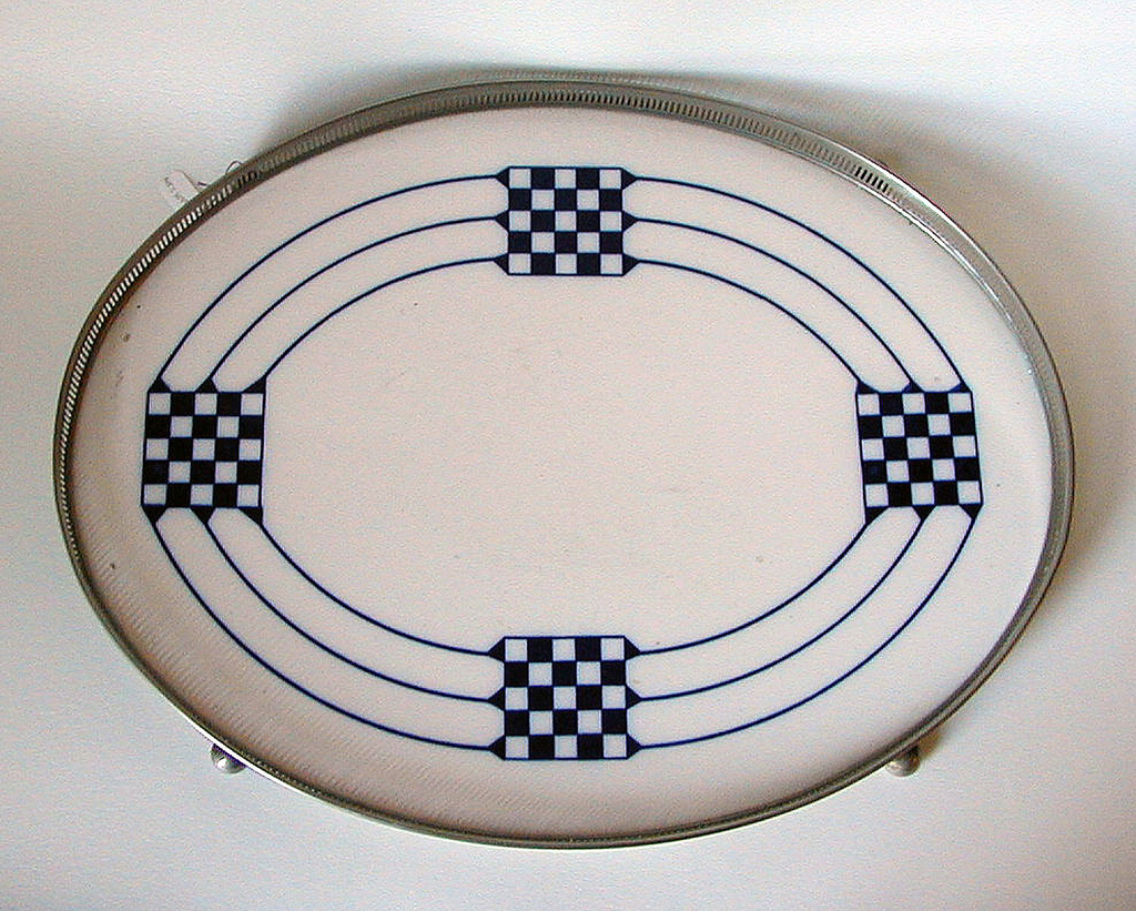 This is a tray. It was manufactured by Wachtersbach. It is dated ca. 1930 and we acquired it in 2001. Its medium is glazed earthenware, metal. It is a part of the Product Design and Decorative Arts department.