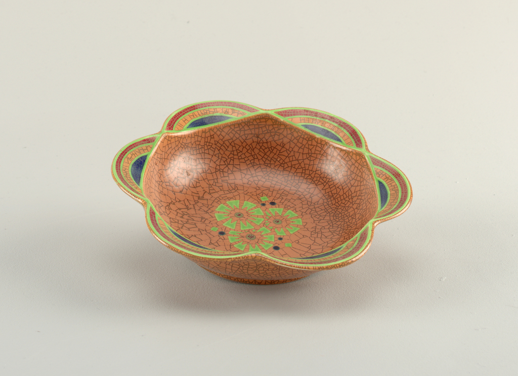 This is a Bowl. It was designed by Eduard Schweitzer and manufactured by Wachtersbach. It is dated ca. 1930 and we acquired it in 2001. Its medium is glazed earthenware. It is a part of the Product Design and Decorative Arts department.