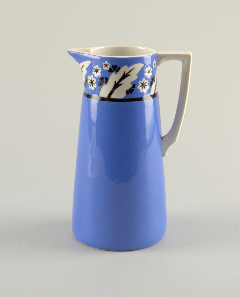This is a Pitcher. It was manufactured by Villeroy and Boch. It is dated ca. 1930 and we acquired it in 2002. Its medium is glazed earthenware. It is a part of the Product Design and Decorative Arts department.