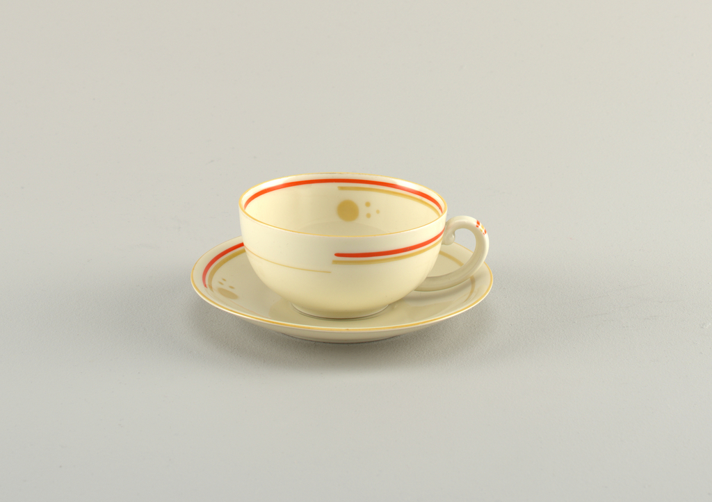 This is a cup and saucer. It was manufactured by Zeh, Scherzer & Co.. It is dated ca. 1930 and we acquired it in 2002. Its medium is glazed porcelain. It is a part of the Product Design and Decorative Arts department.