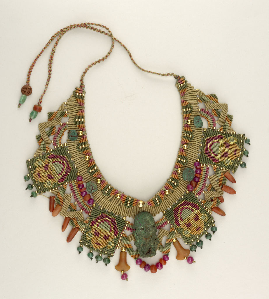 Witt’s neckpieces usually begin with a special ornament, or with the interests of a particular client. She works closely with both the object and her client. The whole composition, motifs, and color scheme of a necklace will revolve around the form and meaning of a central antique bead or talisman. Once the nylon threads are hand dyed, Witt chooses the weaving, knotting, or lace-making techniques to best complement the central ornament. Other beads or ornaments are subsequently chosen to strengthen the theme.