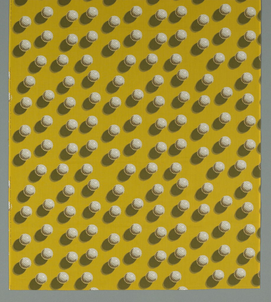 Golf Magic sports a motif of golf balls realistically portrayed with stark shadows on an acid yellow background. It is particularly evocative of the burgeoning pop art movement in the United States and Britain during the 1950s. The fact that the same golf ball is repeated endlessly alludes to mass production, consumerism, and popular culture, all of which are ideas central to the pop art movement.