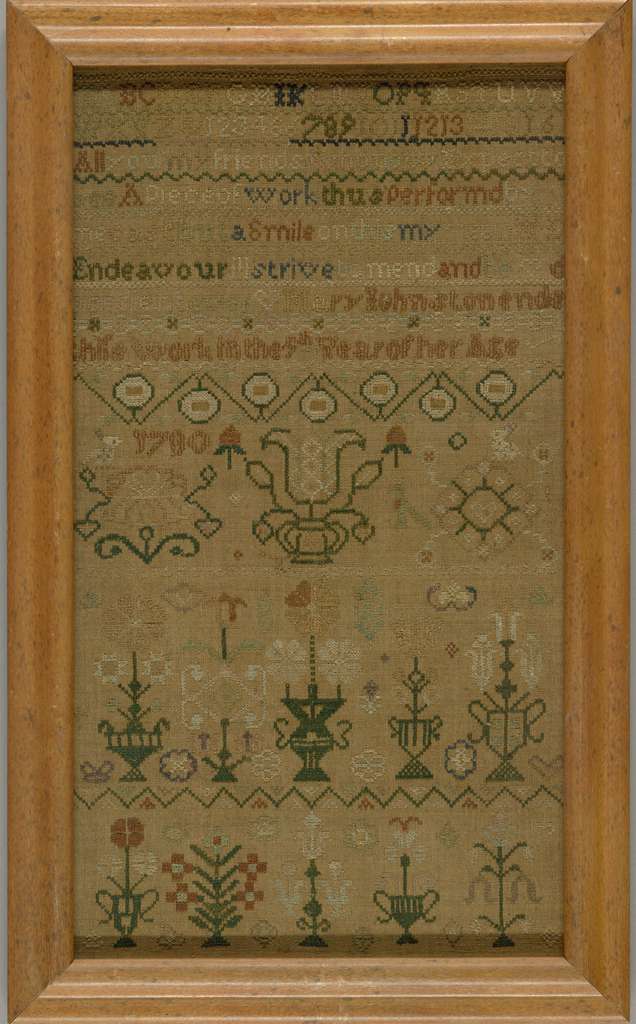 This is a Sampler. It was made by Mary Johnston. It is dated 1780 and we acquired it in 2003. Its medium is linen, silk and its technique is cross stitch embroidery. It is a part of the Textiles department.