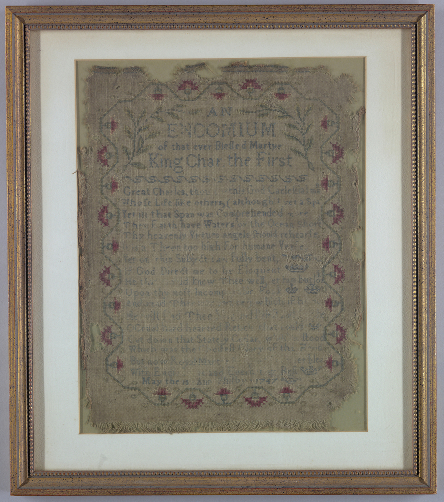 Sampler, An Encomium of that Ever Blessed Martyr King Charles the First; Embroidered by Ann Philby (American); USA; silk embroidery on linen foundation; Frame H x W: 40.6 x 35.6 cm (16 x 14 in.); Gift of Myra and William H. Mathers; 2003-14-16