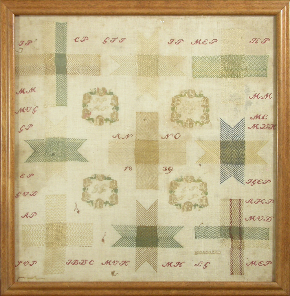This is a Darning sampler. It is dated 1839 and we acquired it in 2003. Its medium is silk embroidery on linen foundation and its technique is cross stitch embroidery, multiple darning stitches. It is a part of the Textiles department.