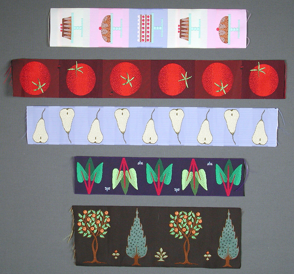 Nicholson received her MFA at Cranbrook Academy of Art and has lectured, taught classes and workshops, and exhibited extensively in the United States. In 1996, the museum acquired Nicholson’s tapestry, Everything for the Garden (1996-78-1), which is a large and playful composition depicting garden tools, vegetables, and flowers. These ribbons are designed in a similar spirit.