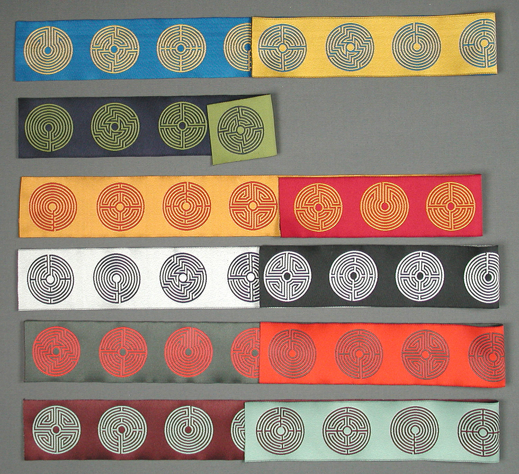 Ribbon And Sample, Labyrinths; Designed by Benjamin E. Nicholson; Produced by RVL Avery Denison; USA; 100% polyester; a. Length: 277 cm [109"], Width: 5 cm [2"] b. Length: 60 cm [23 1/2"], Width: 5 cm [2"]; Gift of Laura Foster Nicholson; 2003-10-18-a,b