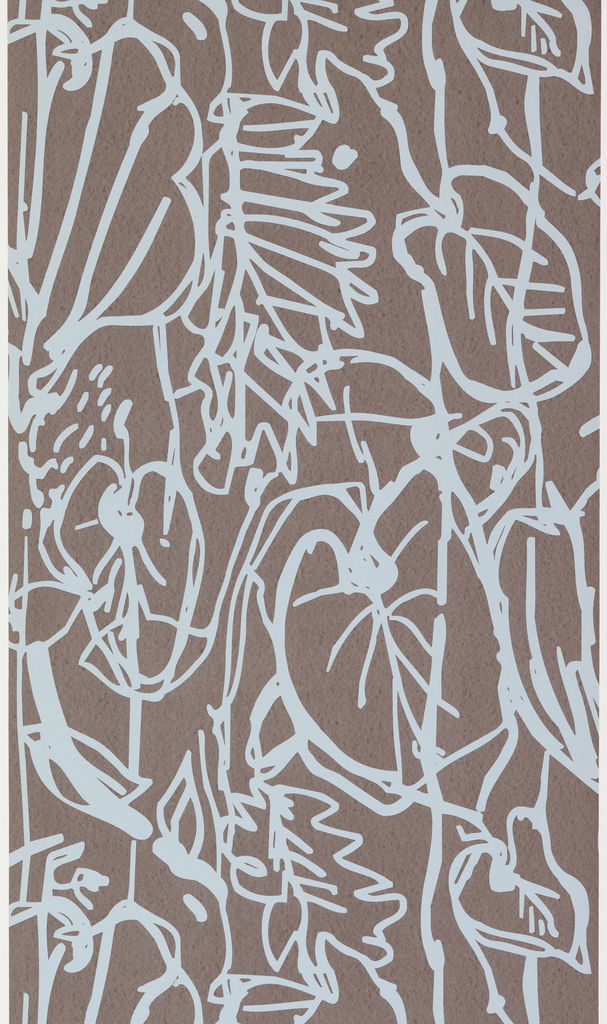 Kew is a new take on the traditional foliate design, based on botanical drawings designer Jocelyn Warner made at Kew Gardens. Warner creates her designs by scanning objects and manipulating the resulting images on her computer to simplify their forms. Kew is composed of bold brushstrokes of plants, screenprinted in one color on a color ground. Warner’s wallpapers illustrate how digital technology is influencing surface design.