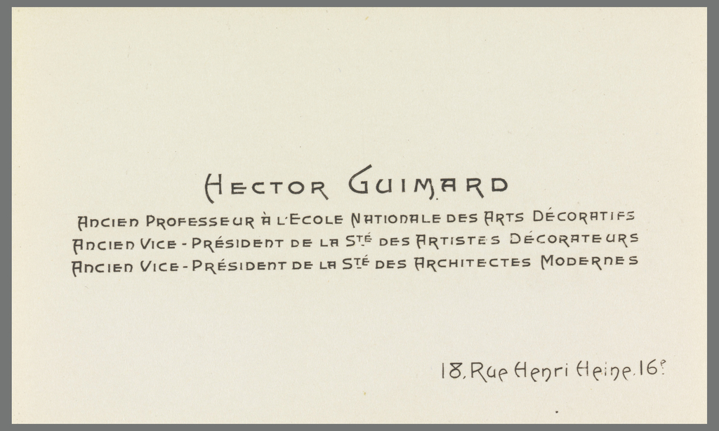Printed in black ink, center: HECTOR GUIMARD / ANCIEN PROFESSEUR À L'ECOLE NATIONALE DES ARTS DÉCORATIFS / ANCIEN VICE-PRÉSIDENT DE LA STÉ DES ARTISTES DÉCORATEURS / ANCIEN VICE-PRÉSIDENT DE LA STÉ DES ARCHITECTES MODERNES; lower right: 18, Rue Henri Heine.16.p
