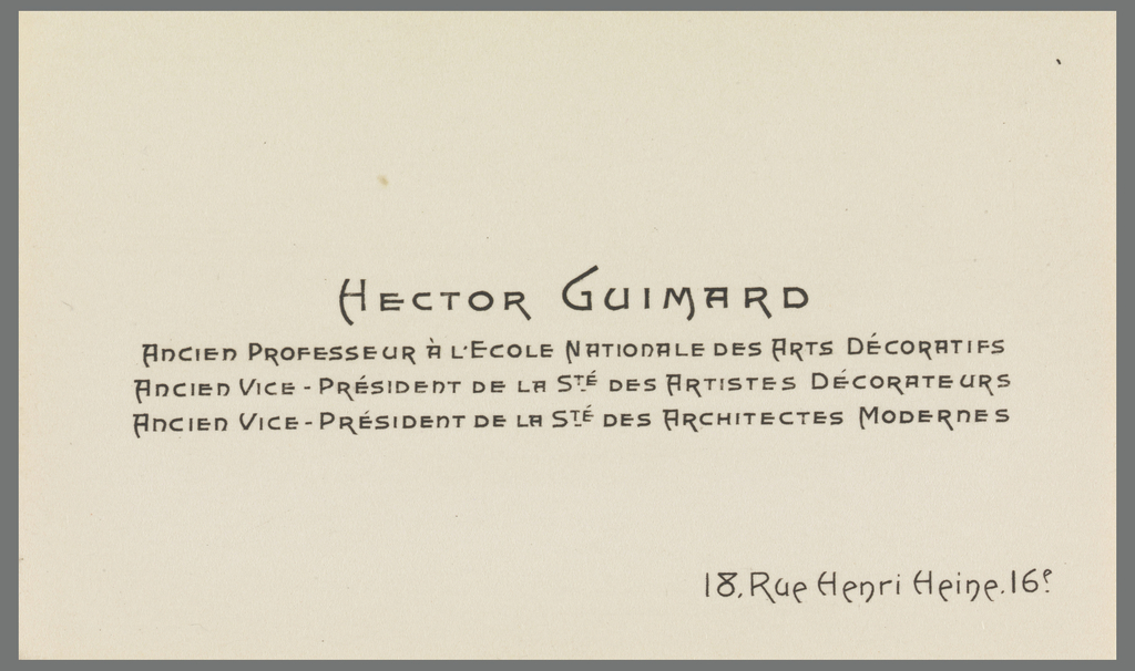 Printed in black ink, center: HECTOR GUIMARD / ANCIEN PROFESSEUR À L'ECOLE NATIONALE DES ARTS DÉCORATIFS / ANCIEN VICE-PRÉSIDENT DE LA STÉ DES ARTISTES DÉCORATEURS / ANCIEN VICE-PRÉSIDENT DE LA STÉ DES ARCHITECTES MODERNES; lower right: 18, Rue Henri Heine.16.p