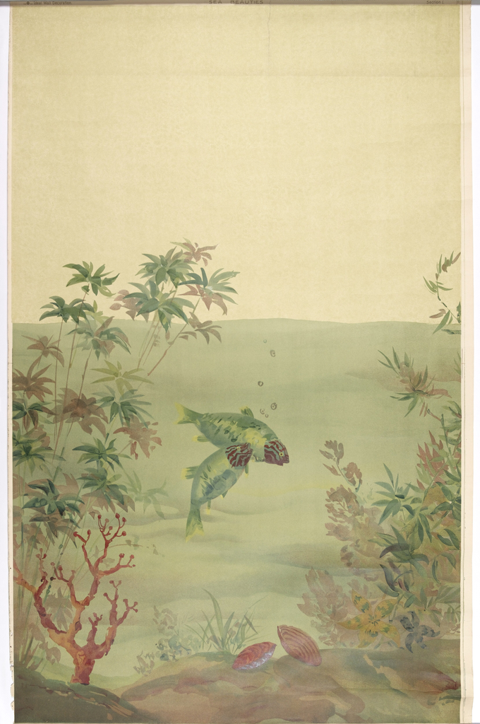 This charming and unusual mural, Sea Beauties (1920–40), is intended for use in a bathroom or washroom. Composed of three sections, the panels are lithographs printed for a very smooth, almost watercolor-like appearance.