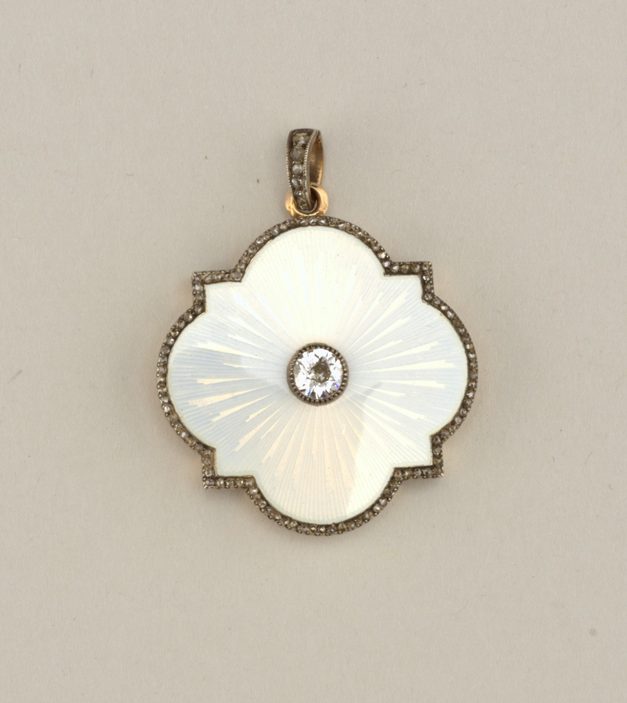 Guilloche Enamel Quatrefoil Locket Locket; Made by August Hollming (Finnish, 1854–1913); Retailed by Fabergé (Russia); Russia; yellow gold (18 kt), white gold (18 kt), enamel, diamonds; H x diam.: 0.5 x 3.3 cm (3/16 x 1 5/16 in.); Bequest of Lorey Katz; 2004-12-1