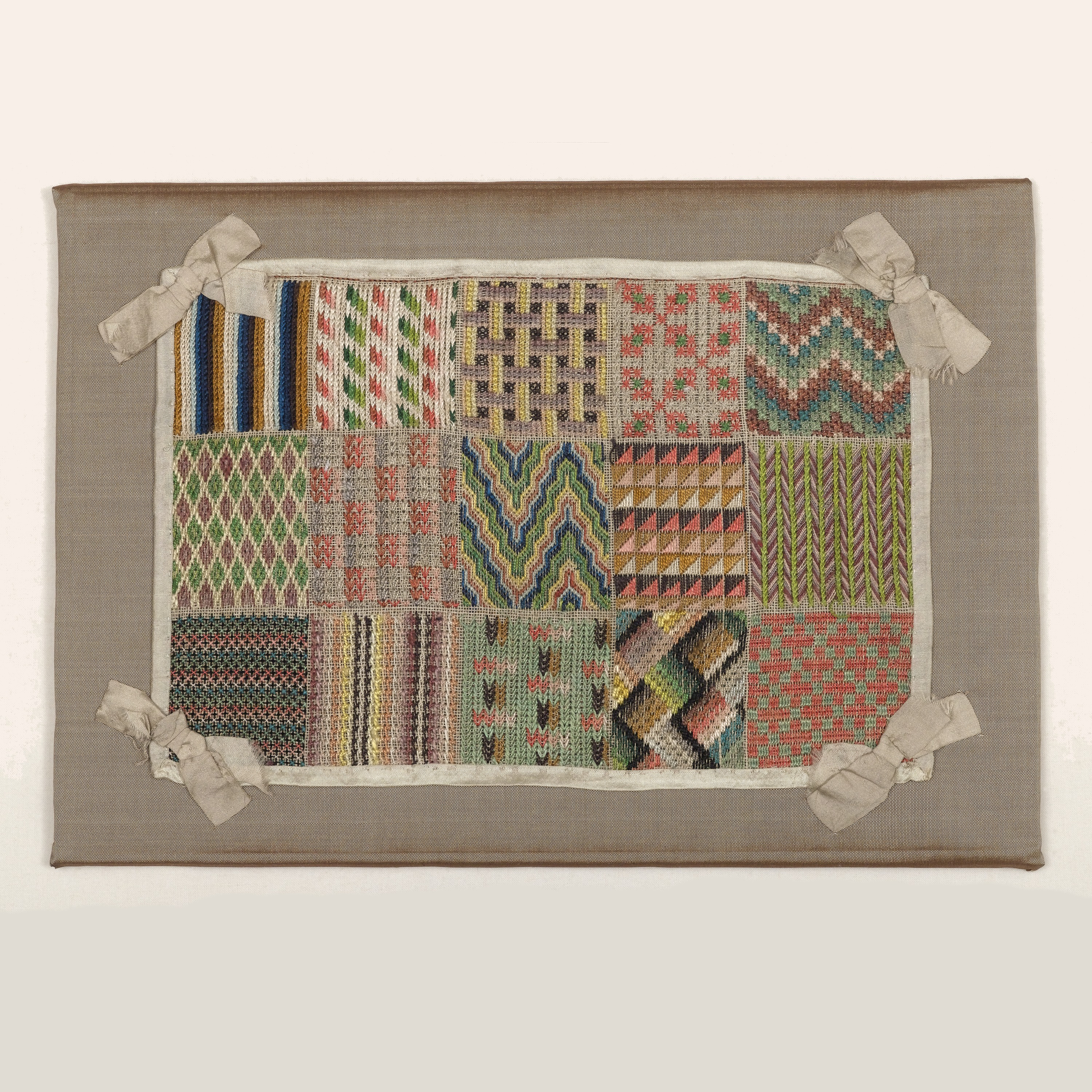 This early 18th-century Austrian sampler, a grid of colorful geometric repeat patterns, was formerly part of the collection of Emma-Henriette Schiff von Suvero née Reitzes. Schiff von Suvero was a member of a very important and influential Jewish family of prominent bankers and owners of the Palais Reitzes in the center of Vienna. She wished to stay in Vienna after the Nazi invasion in 1938 and her art collection was officially inventoried by the Reich in July of that year. Although she was relocated from the Palais, nothing appeared to be immediately confiscated. Her nephew and heir, Erwin Reitzes, however, was considered to be a “half breed of the first class” according to the Nuremberg Race Laws of 1935. He was arrested and later released, and fled to the United States in 1938. When Schiff von Suvero died of natural causes in January of 1939, Reitzes sought but was denied export licenses for his aunt’s collection. Instead, he was forced to negotiate the “sale” of the collection to the Kunstgewerbemuseum (now the MAK, the Austrian Museum of Applied Arts). Over 140 pieces of textile art entered the museum from her collection.