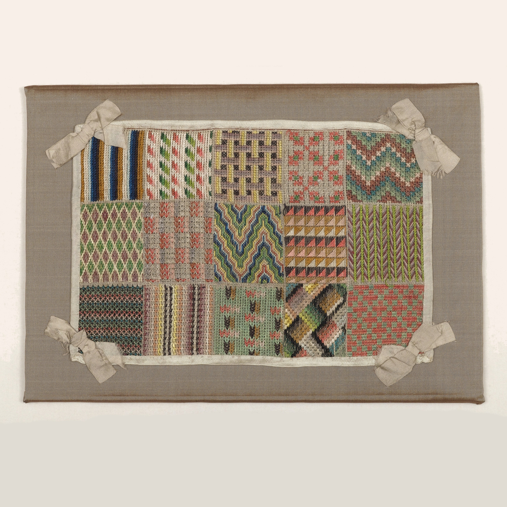 This is a Sampler. It is dated early 18th century and we acquired it in 2005. Its medium is silk embroidery on linen foundation and its technique is embroidered on plain weave. It is a part of the Textiles department.