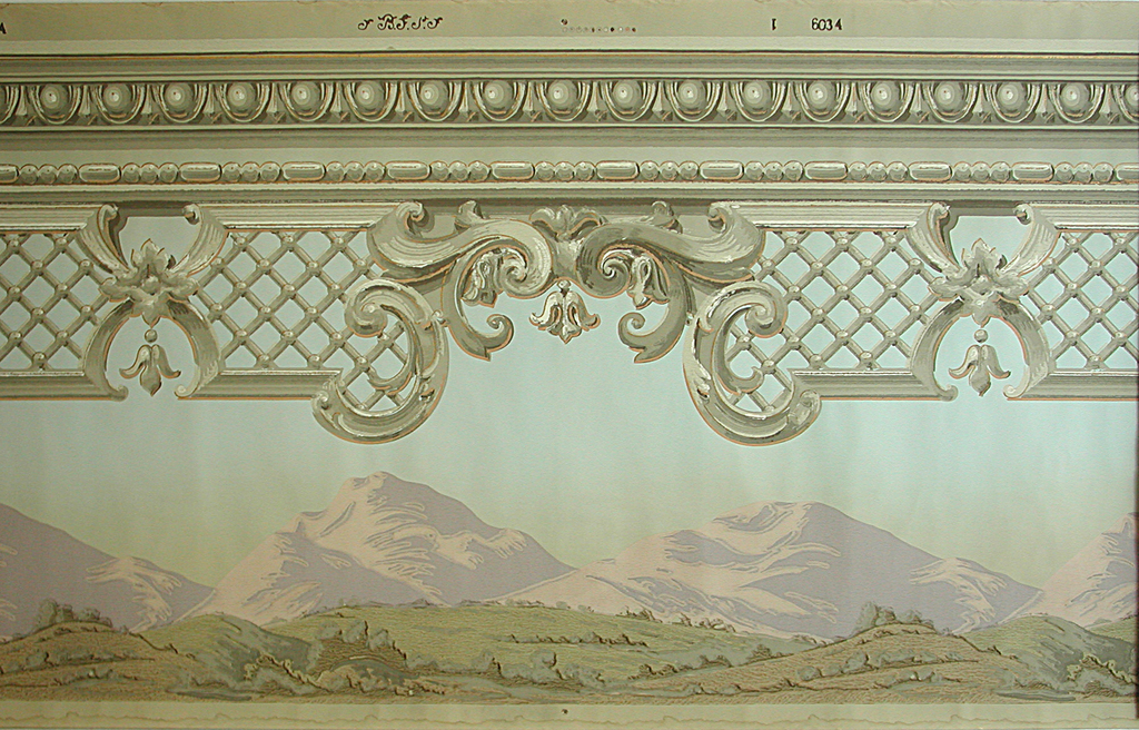 This is an independent landscape frieze. These were very popular from the 1890s through the Arts and Crafts period. This type of frieze could be paired with any available sidewall paper. This particular frieze is quite striking with its elaborate architectural moldings above and the purple mountain vista below. Although the museum has a number of landscape friezes in sample book form, this would be the first large roll of this kind of paper.