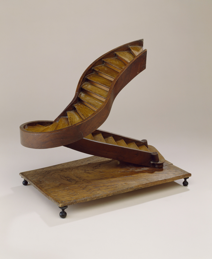 This is a staircase model. It is dated mid–late 19th century and we acquired it in 2007. Its medium is fruitwood (pearwood?), ash (base). It is a part of the Product Design and Decorative Arts department.