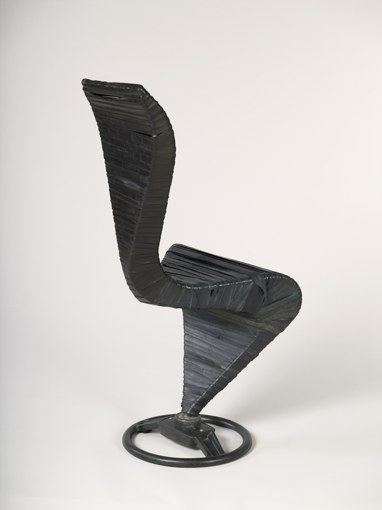 This high-backed chair by British designer Tom Dixon has multiple stretched narrow horizontal strips of recycled automobile rubber tire inner tubes over its welded steel frame on a steering wheel base. S-shaped, the chair’s seat morphs into the backrest in one continuous curve; there are no joints or pieces that need assembly. Dixon taught himself how to rework salvaged materials into functional furniture. His approach here combines recycled materials and fashions them into a sculptural product of high design.