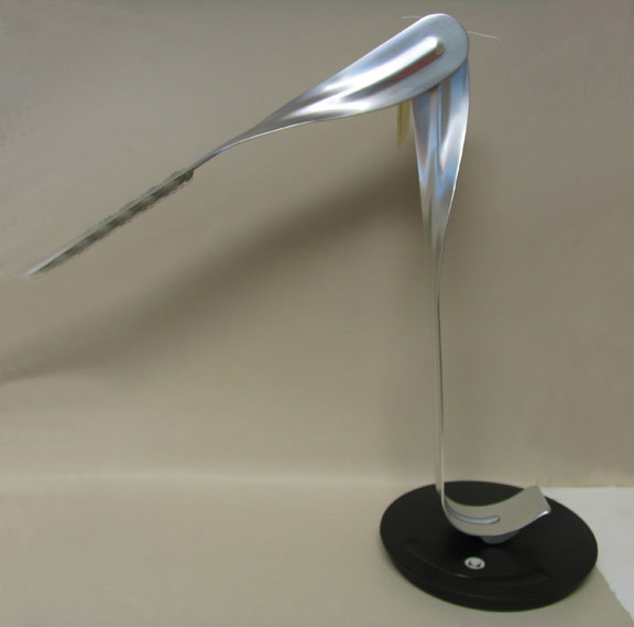 The low, smooth, circular base houses complex circuitry that the user controls by touch. The user modulates light intensity and temperature simply by sliding a finger along the two curved, tapering troughs. The on/off control is a small touch-sensitive circle. By varying both light temperature and intensity, the user can simulate the soft yellow glow of candlelight or choose a more intense incandescent- or fluorescent-like light appropriate for tasks such as sewing, reading, or working at a computer.