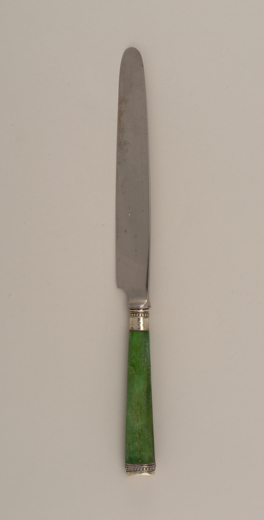 Dinner Knife with Green-Stained Ivory Handle Knife ; England; green-stained ivory, steel, silver; L x W x D: 25.7 × 2.2 × 1.4 cm (10 1/8 × 7/8 × 9/16 in.); Gift of Francis B. Lothrop; 1959-56-1-b