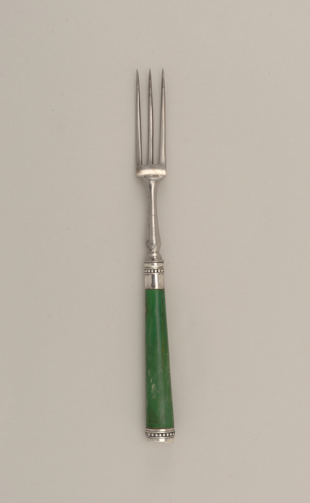 Dessert Fork with Green-Stained Ivory Handle Fork; England; green-stained ivory, steel, silver; L x W x D (f): 18.4 × 1.6 × 1.3 cm (7 1/4 × 5/8 × 1/2 in.); Gift of Francis B. Lothrop; 1959-56-1-f